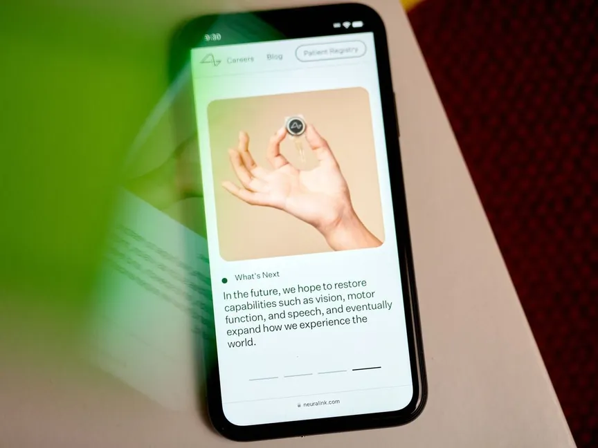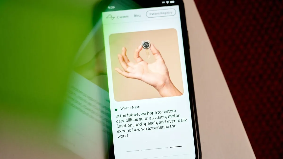 شريحة إلكترونية من شركة Neuralink تظهر على هاتف ذكي في نيويورك. 31 يناير 2024 - Bloomberg