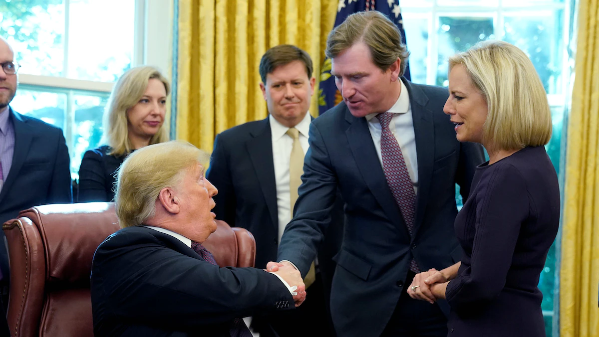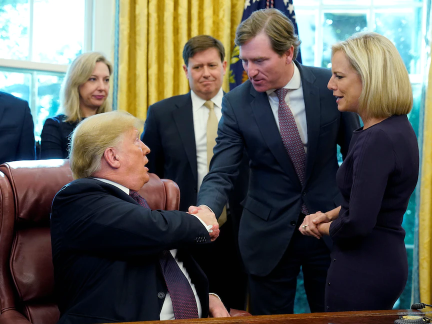مدير وكالة الأمن الإلكتروني، كريس كريبس، يصافح ترمب في إحدى المناسبات بالبيت الأبيض - REUTERS