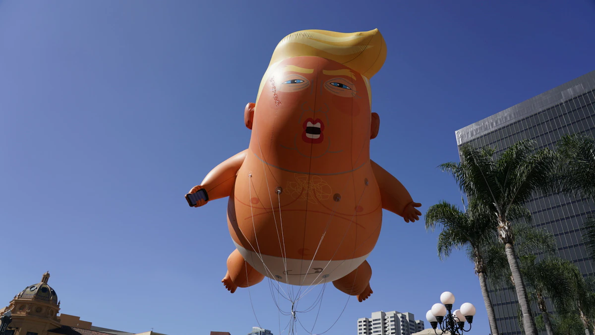 ويصوّر البالون طفلاً أشقر، بشعر يشبه الرئيس الأميركي دونالد ترمب، بوجه غاضب لا يغطي جسمه سوى حفاضة بيضاء، ويحمل بيده هاتفاً محمولاً.