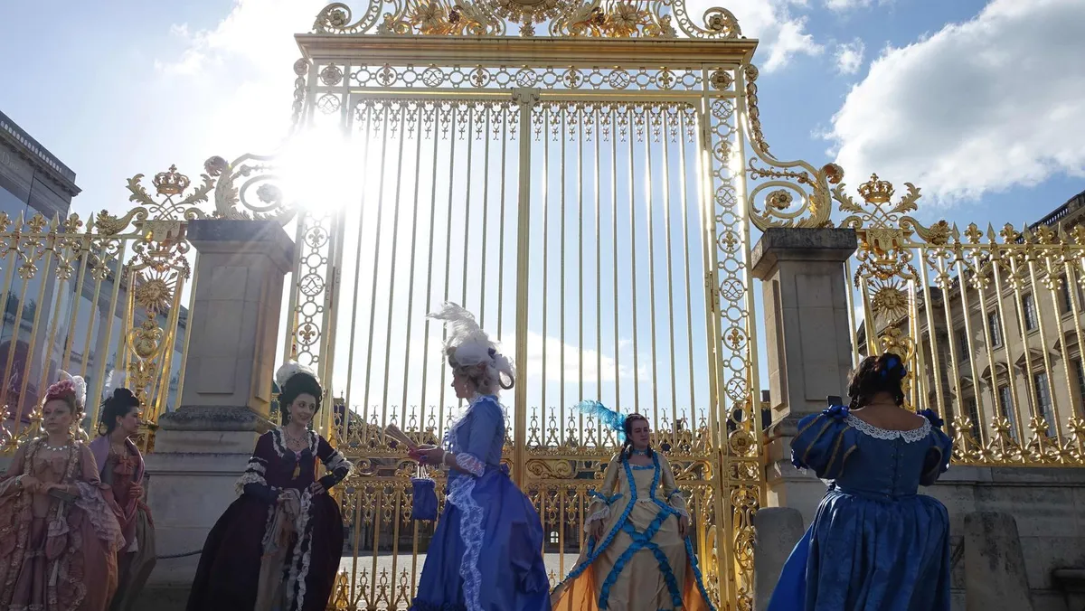 نساء يرتدين أزياء القرن الثامن عشر ينتظرن أمام "قصر فرساي" للمشاركة في مهرجان للاحتفال بسنة لويس الرابع عشر في 1 يونيو 2015 - AFP