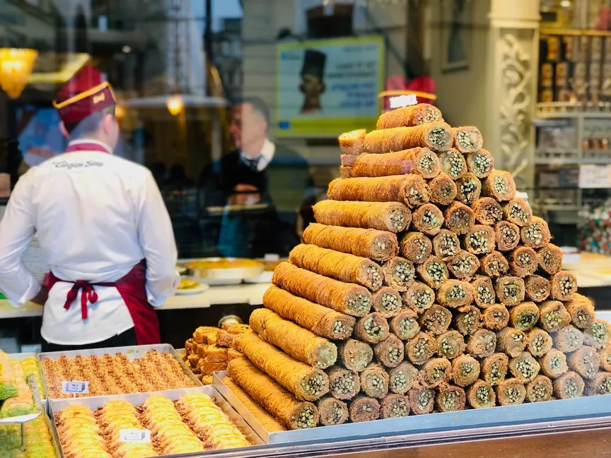 وغالباً ما تحتل البقلاوة واجهات محال بيع الحلويات، وتعتبر "غازي عنتاب" من أكثر الولايات التركية شهرة في جودة تصنيعها. وهي عبارة عن طبقات رقيقة من العجين محشوّة بالمكسرات ومحلّاة بالعسل أو ماء السكر.