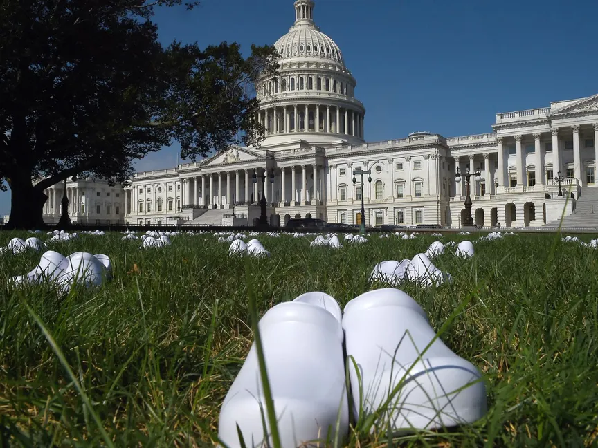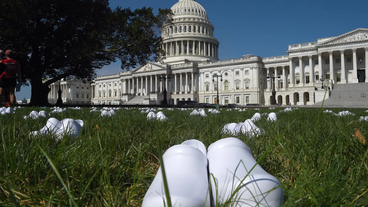 في تحية من أمام مبنى الكونغرس، وضعت النقابة الأميركية للعاملين في مجال التمريض 164 زوجاً من الأحذية البيضاء، تقديراً وتكريماً للممرضات اللاتي توفين جرّاء إصابتهن بفيروس كورونا، ولمطالبة مجلس الشيوخ بإقرار خطة مساعدات ضخمة للتصدي للجائحة.