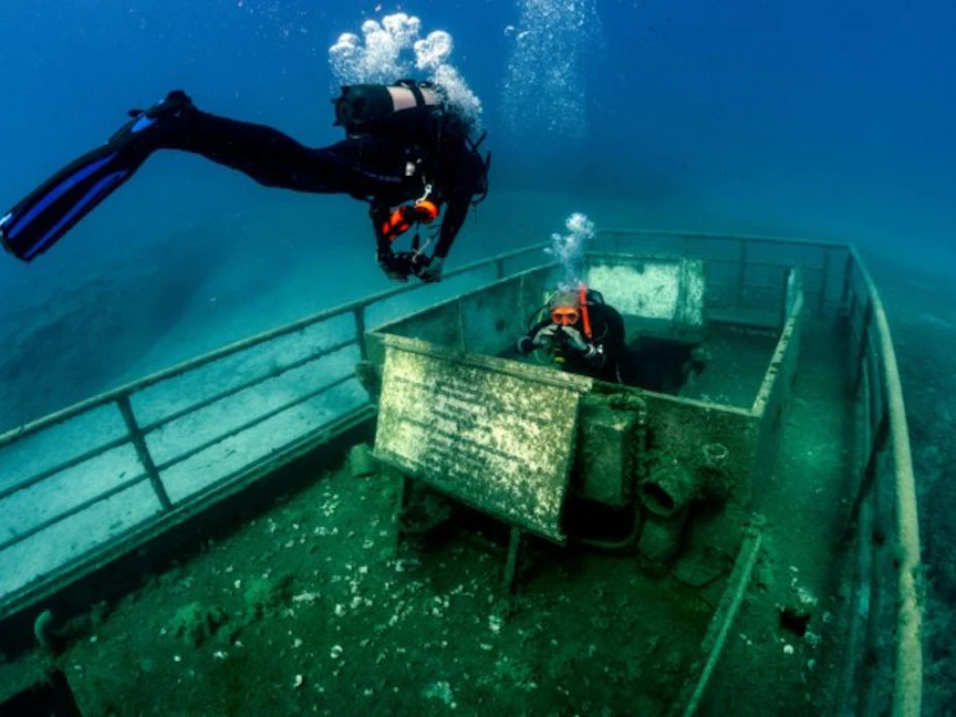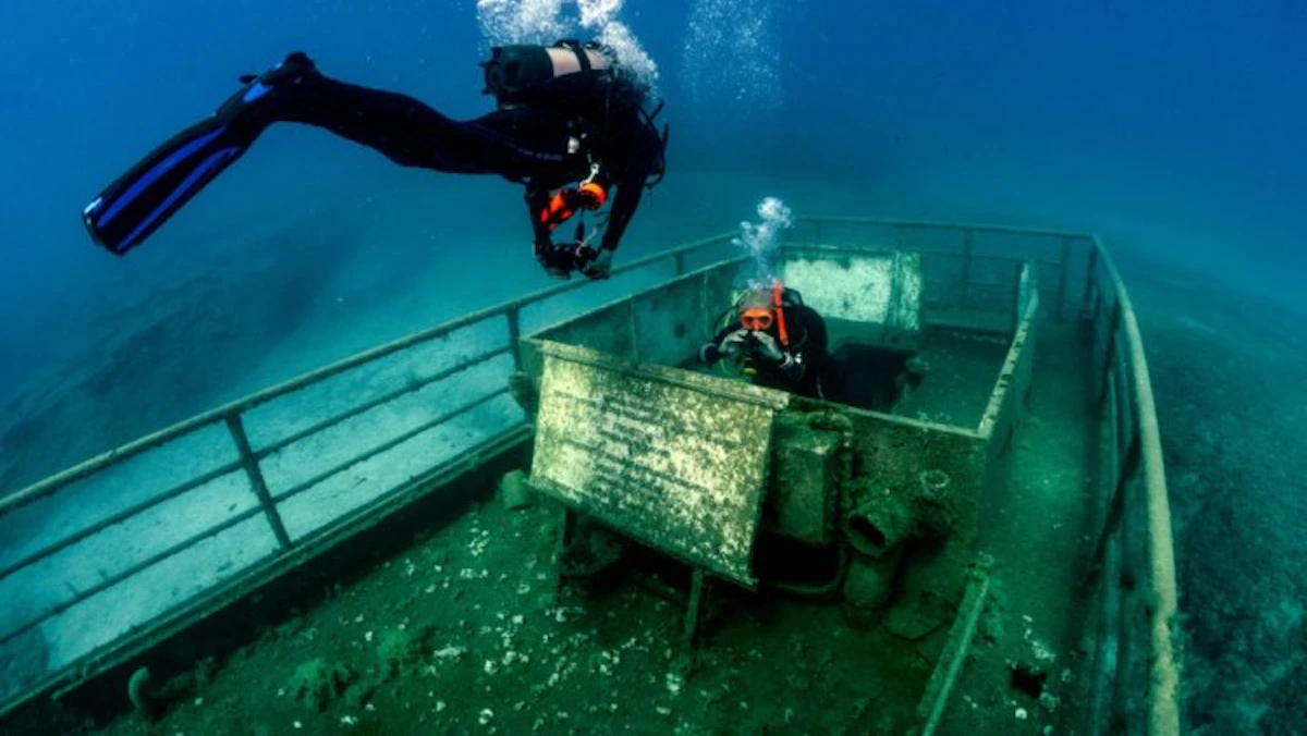 ويسبح الغواصون حول حطام السفينة "ليف 1" قبالة الساحل الجنوبي للجزيرة، وسط مياه ضحلة تعج بأسماك الآنسة السوداء، ويصورون هذا المشهد الواقع على عمق عشرة أمتار، فيما تخترق أشعة الشمس صفحة الماء متسللة إلى العمق.