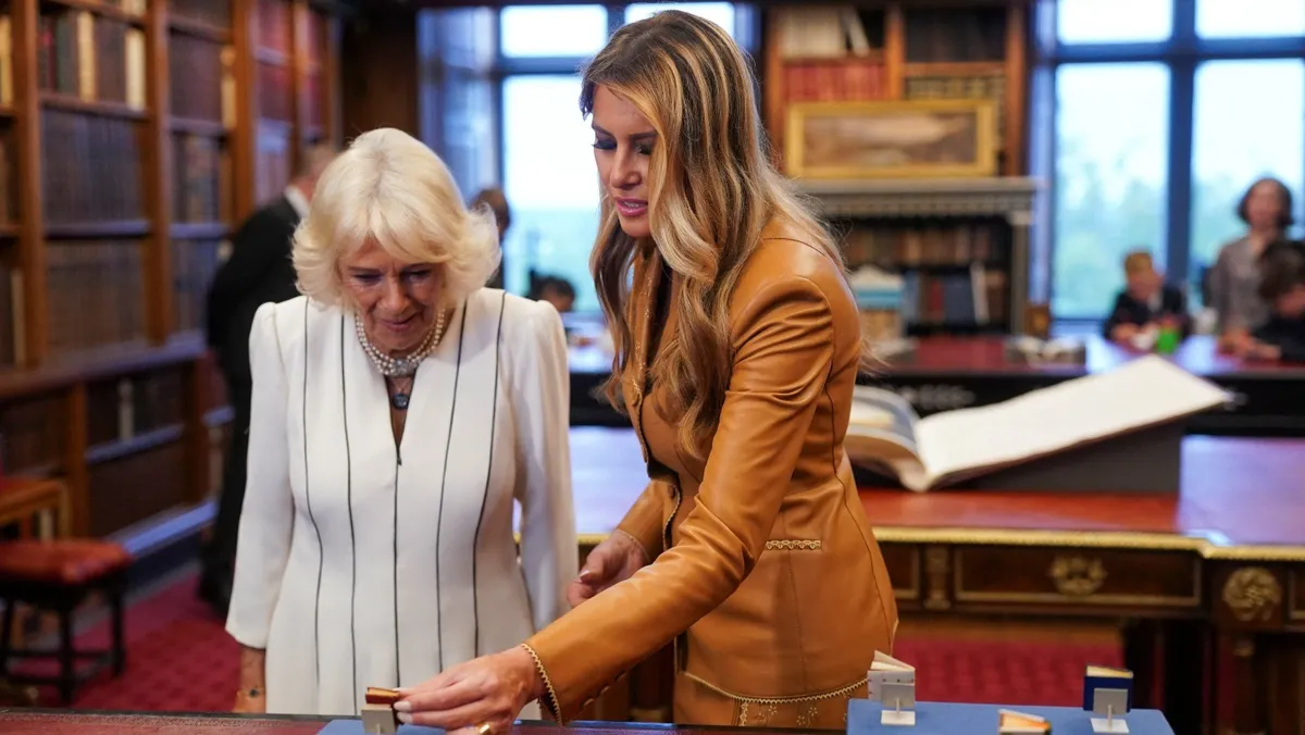 اصطحبت ملكة بريطانيا كاميلا والأميرة كيت ميدلتون السيدة الأولى للولايات المتحدة ميلانيا ترمب في جولة بالمكتبة الملكية في وندسور، في اليوم الثاني من زيارة الرئيس الأميركي دونالد ترمب للبلاد.