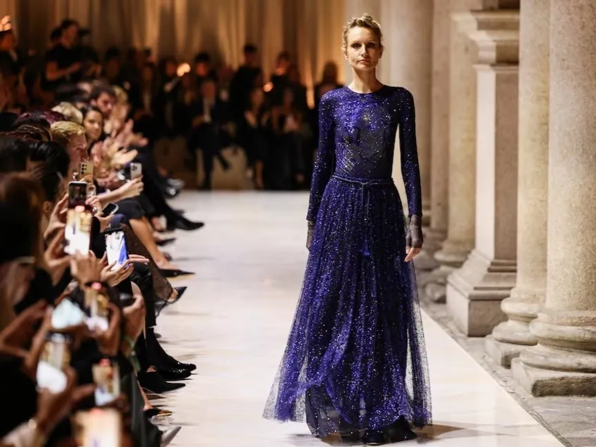 واختُتم العرض بمسيرة فردية للعارضة أجنيسي زوجلا، إحدى العارضات المفضلات لدى المصمم، والتي تألقت بفستان أزرق أنيق.