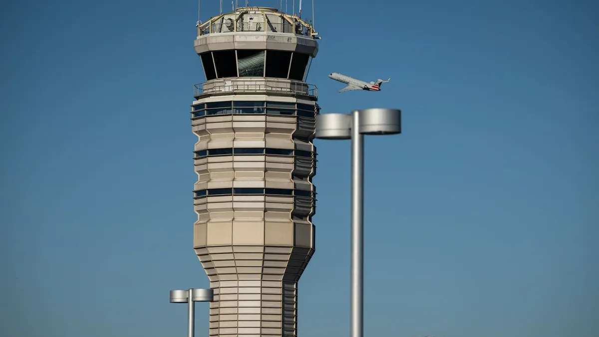 طائرة تابعة لشركة "أميركان إيرلاينز" بالقرب من برج مراقبة الحركة الجوية في مطار رونالد ريجان الوطني، 6 نوفمبر 2025. - Bloomberg