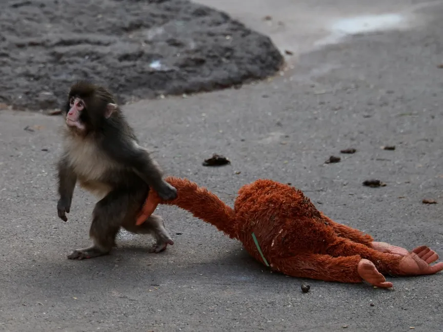 في حديقة حيوانات خارج العاصمة اليابانية طوكيو، أصبح قفص القردة مقصداً لا يمكن أن يفوته الزوار بفضل ثنائي لا ينفصل؛ هما القرد الصغير بانش ودميته المحشوة.