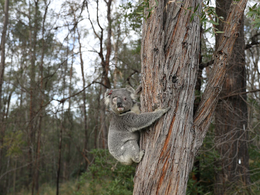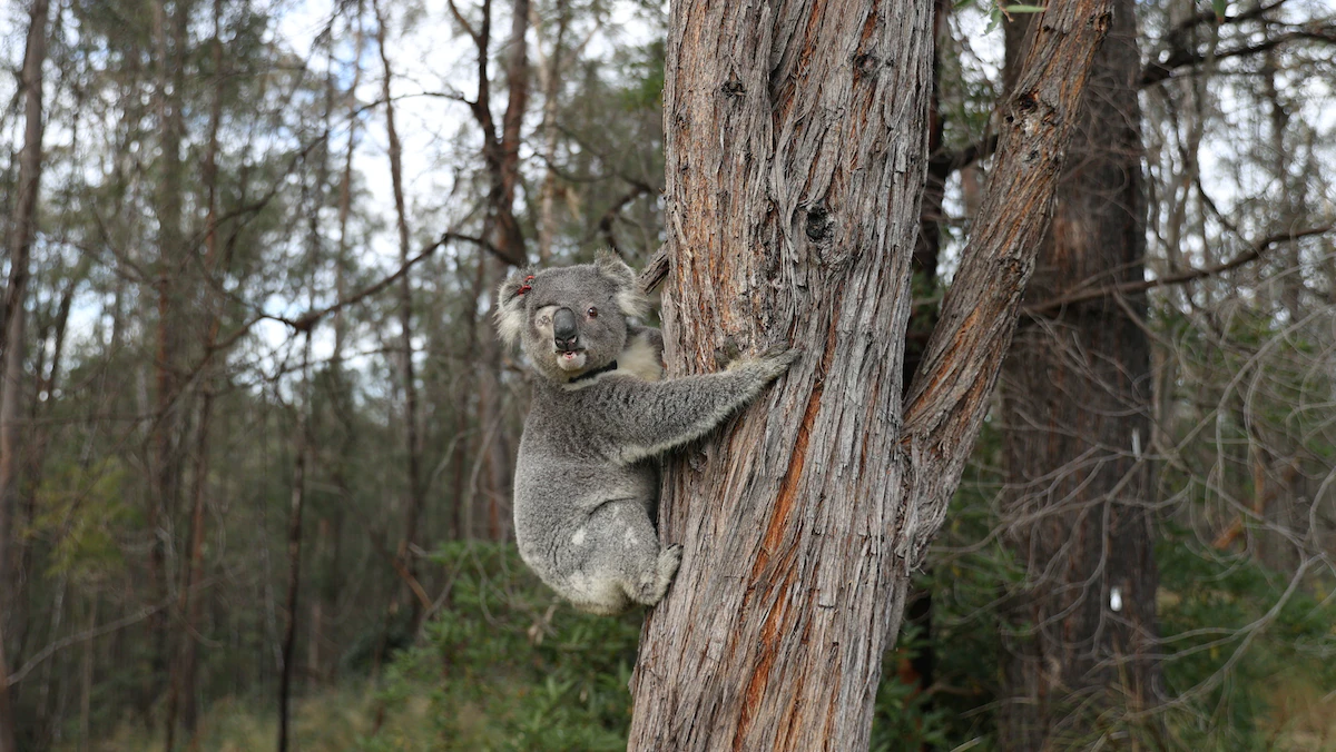 كوالا تم إنقاذه يتسلق شجرة في موطنه الطبيعي في وادي جروس بقرب سيدني الأسترالية بعد علاجه من عدة إصابات بما فيها فقدان إحدى عينيه يوم 25 يوليو 2020 - REUTERS