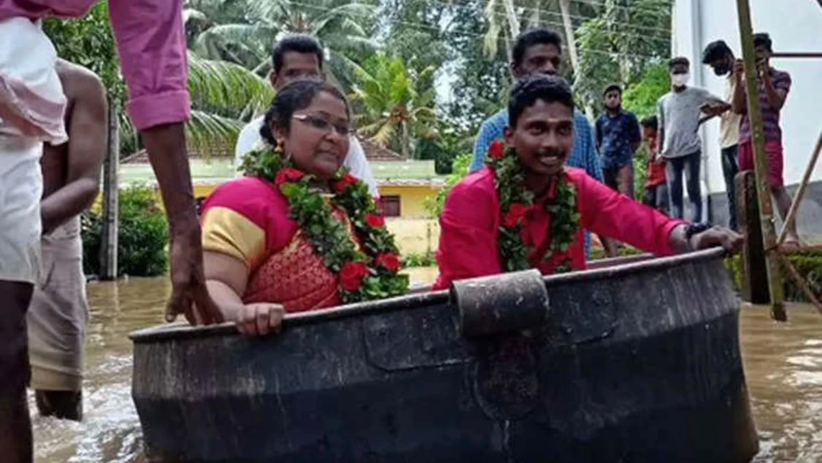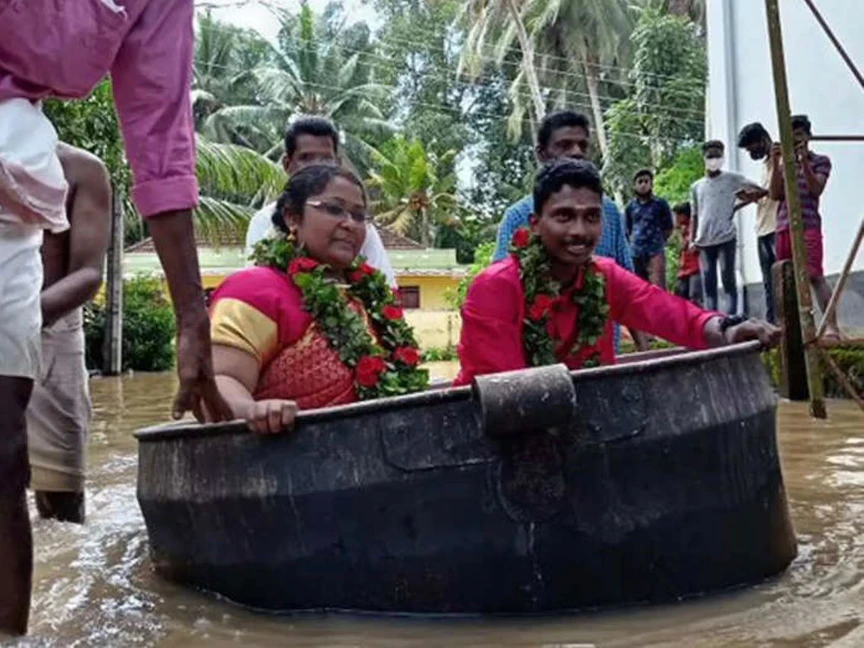 جاب عروسان هنديان شوارع غمرتها المياه بسبب الفيضانات في ولاية كيرالا جنوبي الهند، داخل إناء طهي ضخم، الاثنين، للوصول إلى مكان زفافهما.