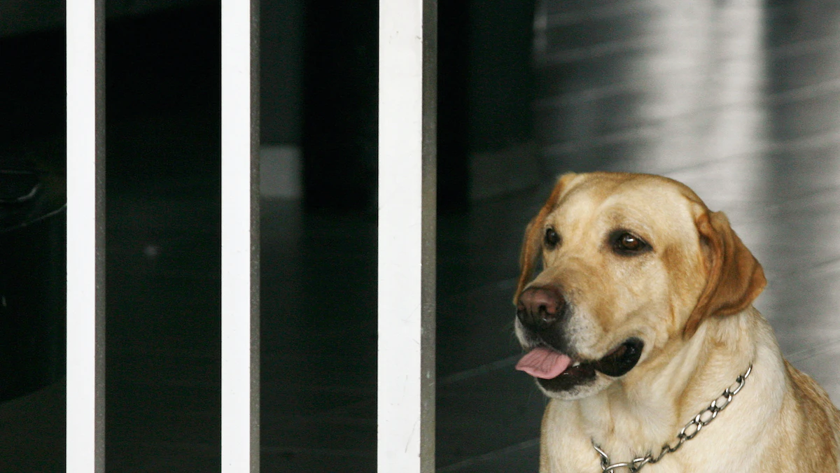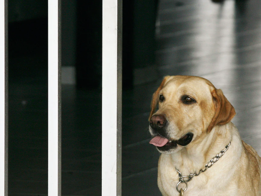 كلب الشرطة الكولومبي أجاتا، لابرادور الذهبي، تنتظر بدء عملها اليومي في مطار فاسكيز كوبو في ليتيسيا- 18 يناير 2007. - REUTERS