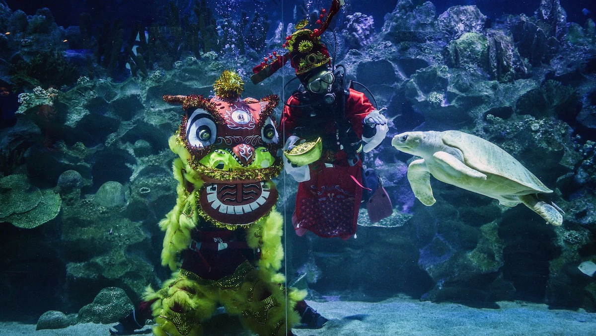 أدّى راقصون الجمعة، ما يُسمّى بـ"رقصة الأسد" تحت الماء في حوض مائي ماليزي، بينما تسبح الأسماك والسلاحف حولهم، وذلك في عرض بمناسبة السنة القمرية الجديدة.