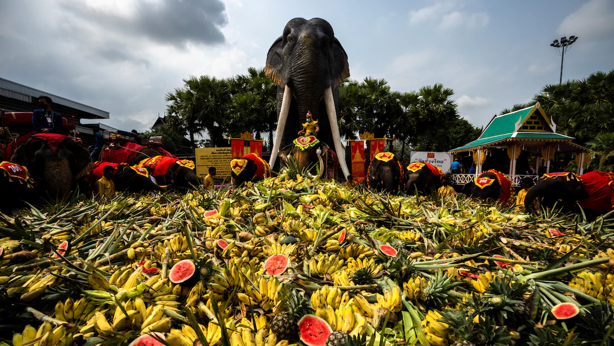 مدّت تايلاند، الأحد، سفرة عامرة بالفاكهة والخضراوات المحببة لدى الحيوان الوطني للبلاد "الفيل"، حيث شارك 60 فيلاً محظوظاً خلال اليوم السنوي لهذا الحيوان الضخم.