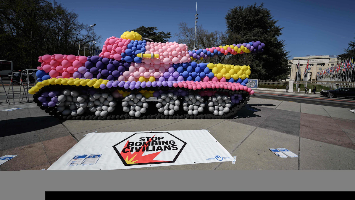وُضعت دبابة بالحجم الطبيعي مصنوعة من بالونات ملونة أمام مكتب الأمم المتحدة في جنيف بسويسرا، الثلاثاء، احتجاجاً على قصف المدنيين في مناطق حضرية بأوكرانيا وأماكن أخرى.