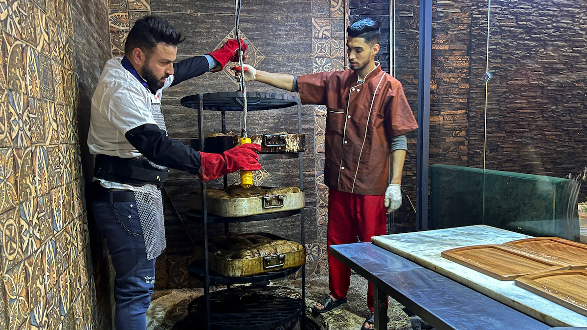 وحفر حليمي حفرة صغيرة في مطبخه، حيث يدفن اللحم تحت حجارة بعد تسخينها بالفحم لساعات، ويضيف صلصة خاصة للحم تجعله مقرمشاً من الخارج وطرياً من الداخل.