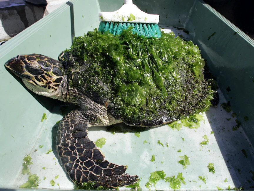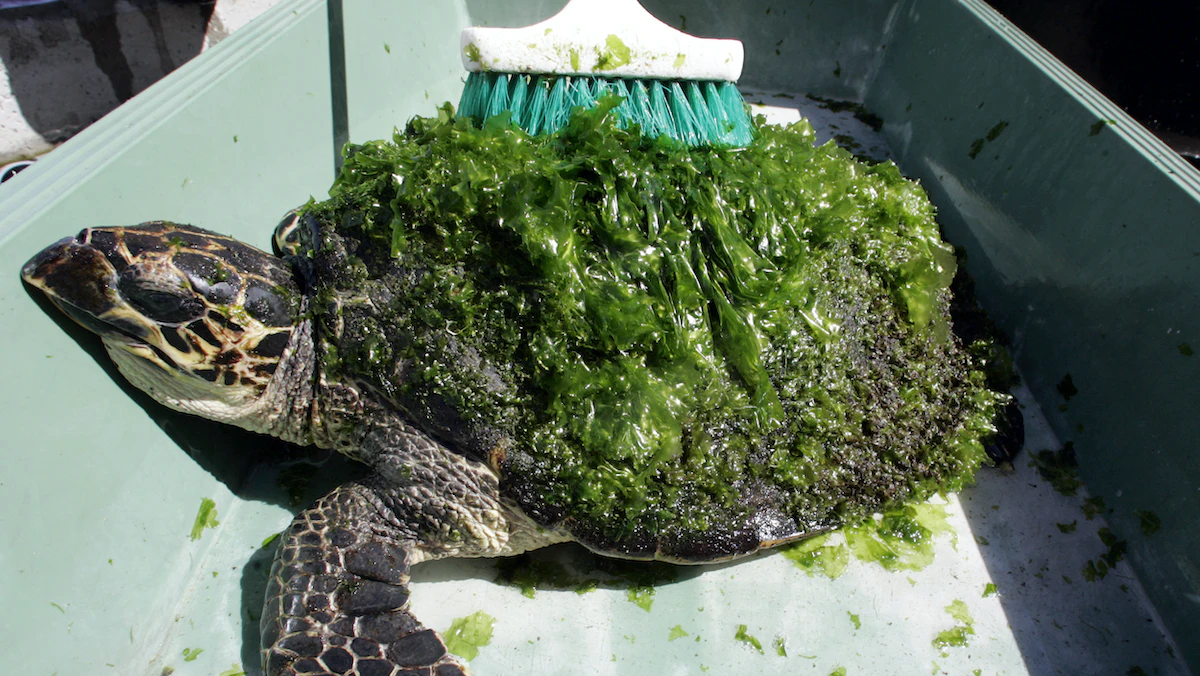 تنظيف سلحفاة مغطاة بالأعشاب البحرية بفرشاة في حوض أسماك Okinawa Churaumi بمدينة موتوبو بجزيرة أوكيناوا جنوب اليابان - 9 يوليو 2007 - REUTERS