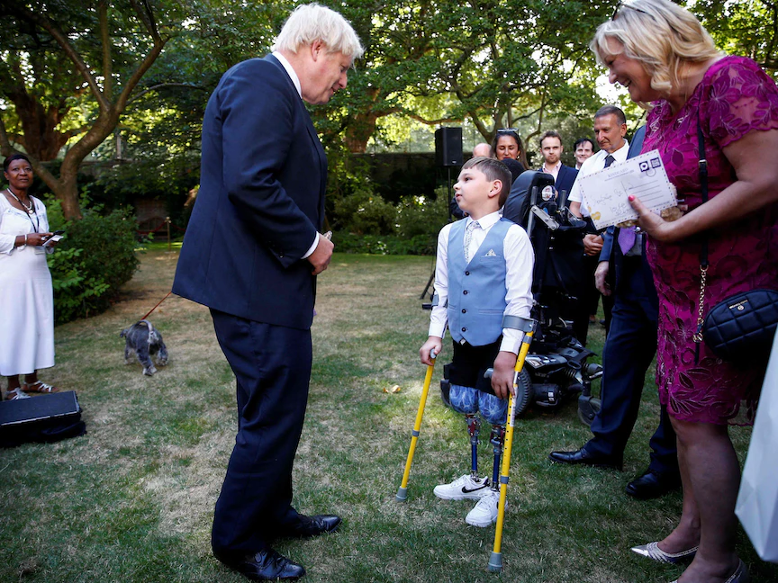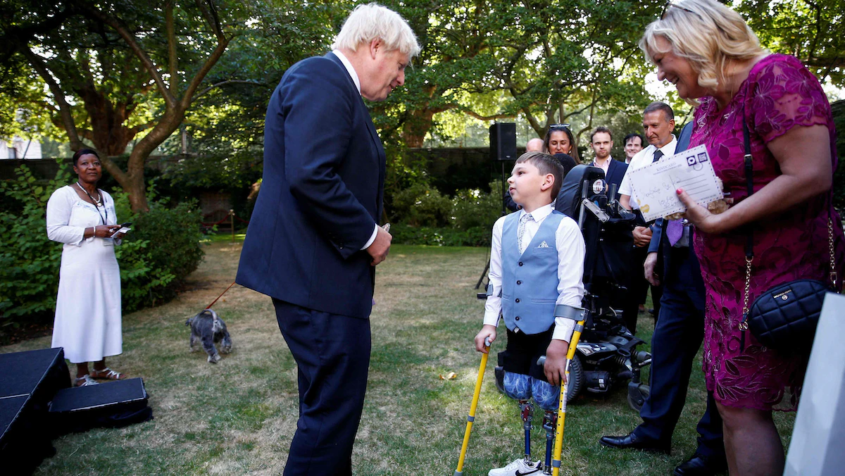 رئيس الوزراء البريطاني بوريس جونسون يلتقي الطفل توني هودجيل خلال فعالية بمقر رئاسة الوزراء في العاصمة البريطانية لندن- 9 أغسطس 2022 - AFP