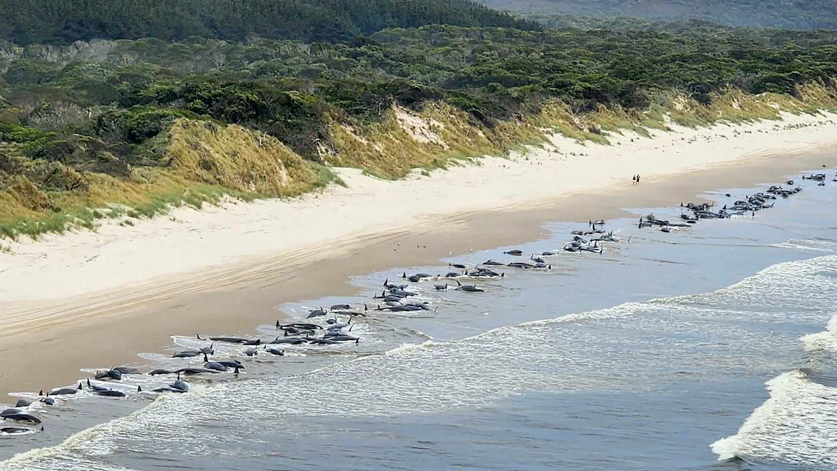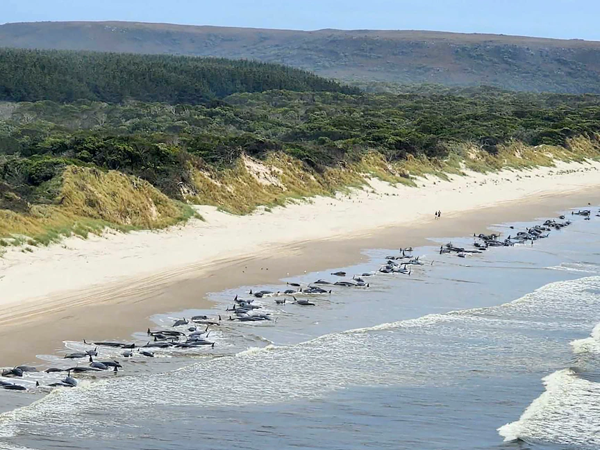 وقالت وزارة الموارد الطبيعية والبيئة في الولاية إن "مجموعة تضم نحو 230 حوتاً جنحت قرب ميناء ماكواري"، مضيفةً "يبدو أن نصف هذه الحيوانات لا تزال حيّة".