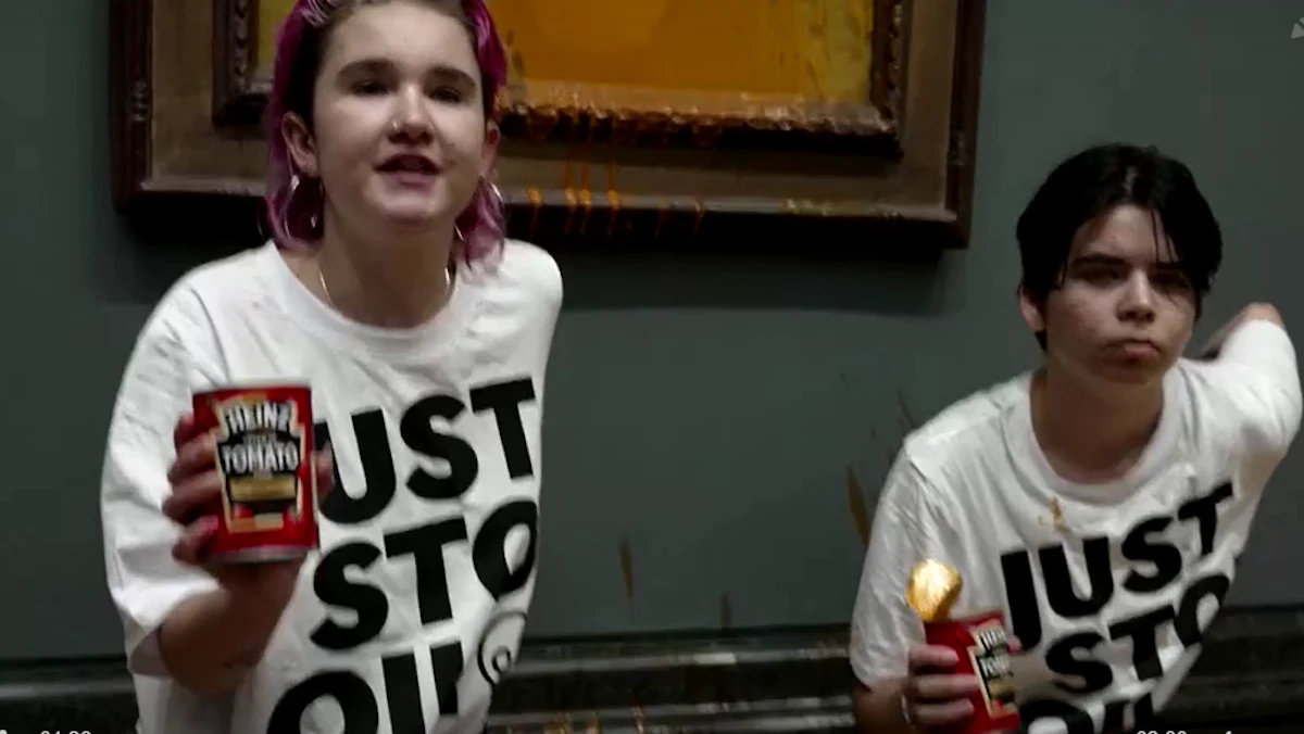 وأظهر مقطع فيديو نشرته جماعة (Just stop oil)، التي نظمت احتجاجات خلال الأسبوعين الماضيين في العاصمة البريطانية، امرأتين تلقيان علبتين من حساء الطماطم من شركة "هاينز" على اللوحة.