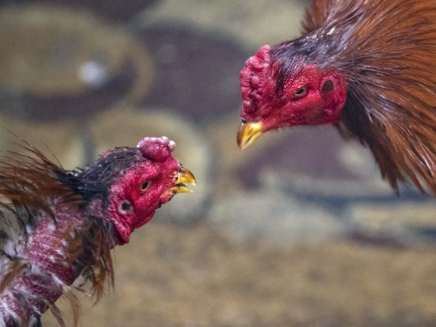يتناحر الديكان صاحبا العرف الأحمر، ويدوران حول بعضهما البعض على سجادة متسخة، في رقصة دموية، يقفزان تارةً، ويضربان رقاب بعضهما بعنف طوراً، ما يخلف بقع دم على الأرض.