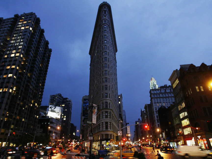 ويتألف مبنى "فلاتيرون" من 22 طابقاً يضم مكاتب، ويبلغ طوله 87 متراً، ويقع في وسط مانهاتن عند تقاطع شارع 22 و"فيفث أفينيو" وبرودواي، وعلامته الفارقة هي كونه على شكل مثلث.