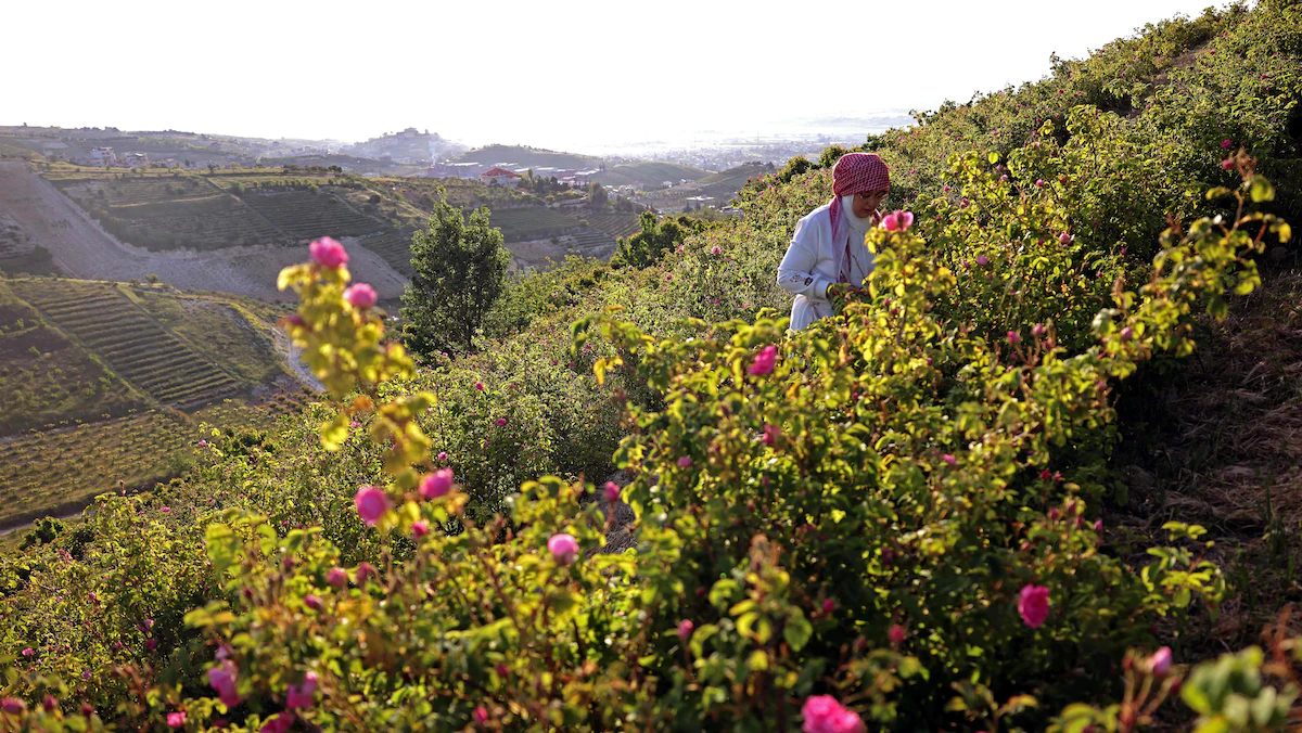 مع شروق الشمس، يشق القرويون طريقهم إلى منحدرات جبلية خضراء يكسوها اللون الزهري، ليبدأوا أيامهم الربيعية بقطاف الوردة الشامية العطرة، وجمعها بعناية في أكياس بلاستيكية.