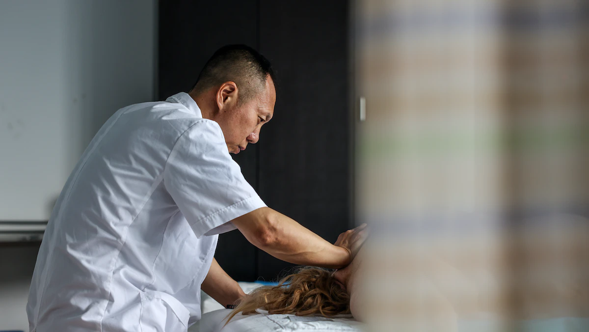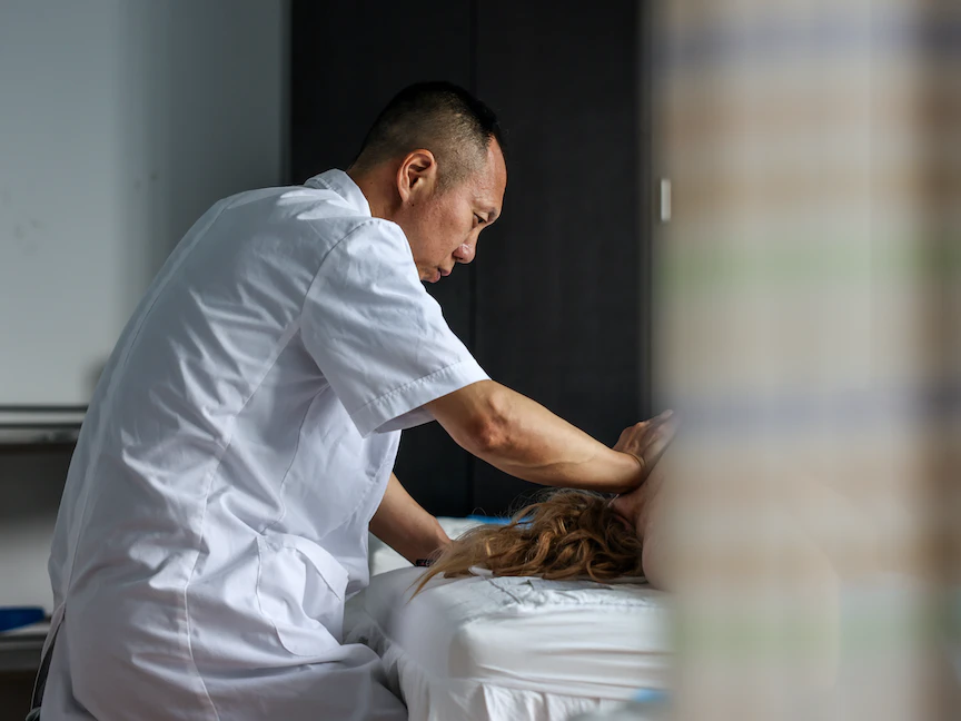 طبيب صيني يجري علاجاً تقليدياً لمريض في مستشفى بهونتشون بمقاطعة جيلين. 28 يونيو 2023 - AFP
