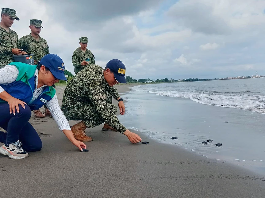 واحتضن متطوعون من البحرية الكولومبية والجيش الوطني السلاحف الصغيرة بأياديهم قبل إنزالها بلطف إلى القناة المائية الضحلة التي تظهر منها أعشاب خضراء.