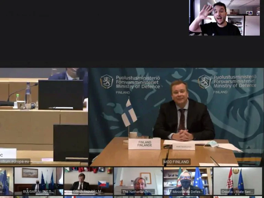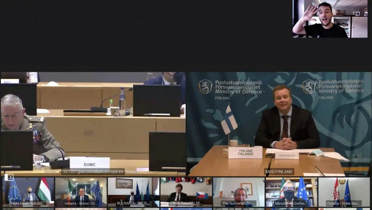 وفقاً لقناة "آر تي إل" الخاصة، اقتحم الصحافي دانيال فيرلان اجتماعاً مغلقاً لوزراء دفاع الاتحاد الأوروبي بعد اكتشافه جزءاً من رمز سري في صورة وزيرة الدفاع الهولندية أنك بييليفيلد التي تعمل عن بعد.