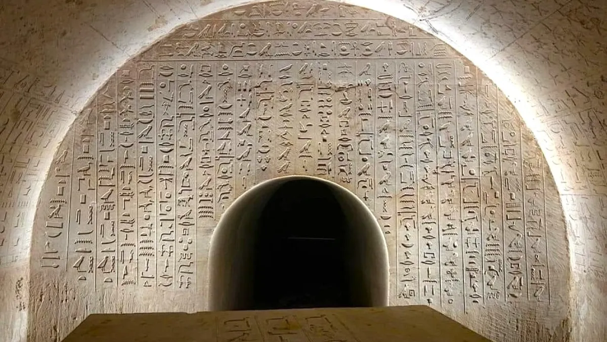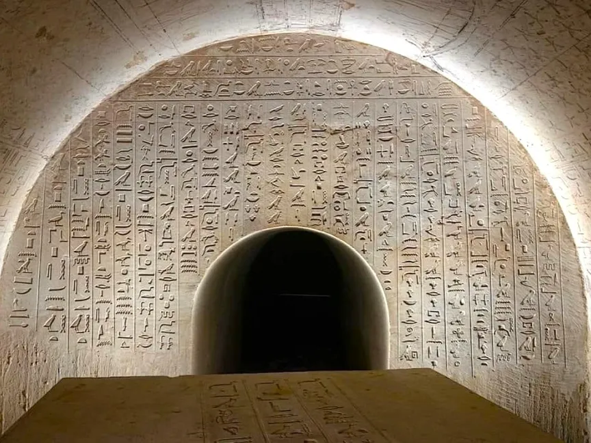 وقال مدير البعثة التشيكية مارسلاف بارتا، "إن المقبرة شيّدت على شكل بئر تنتهي بحُجرة للدفن، تحوي كتابات هيروغليفية، كما أن حجرة دفن "جحوتي إم حات" غنية بالنصوص والمناظر، إذ توجد على الجدار سلسلة طويلة من النصوص الدينية ضد لدغات الثعابين، مقتبسة من نصوص الأهرام، ونقوشات لقرابين طقسية، ومنظر لرحلة الشمس عبر السماء في مراكبها الصباحية والمسائية مصحوبة بتراتيل شروق الشمس وغروبها.