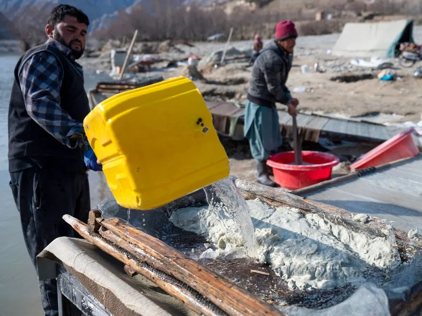 على ضفاف نهر كوكشة، الذي يتدفق بين القمم المغطاة بالثلوج، يستخدم الرجال دلاء لصب الماء على أكوام الغبار، ثم يعمدون إلى غربلتها فوق مادة مأخوذة من داخل سيارة وممدودة على قطع من الخشب.