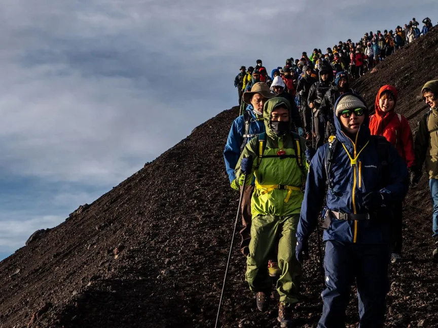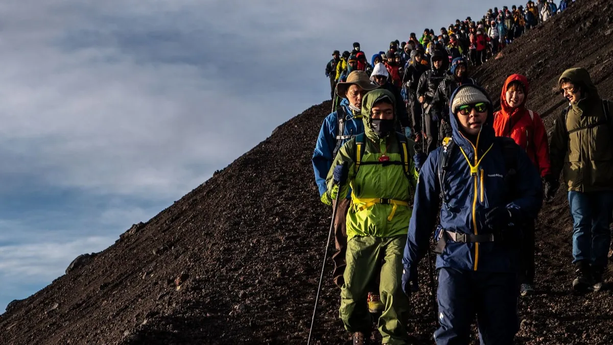 ويشهد أعلى جبل في اليابان ازدحاماً متزايداً خلال موسم المشي لمسافات طويلة في الصيف، ما يثير مخاوف بشأن السلامة والأضرار البيئية.