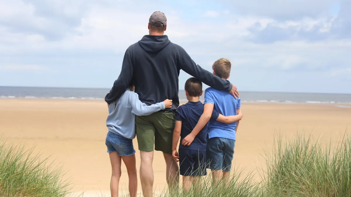 وتظهر الصورة الأطفال الثلاثة؛ الأمير جورج (10 أعوام)، والأميرة شارلوت (تسعة أعوام)، والأمير لويس (ستة أعوام)، وهم يعانقون أبيهم على أحد الشواطئ.