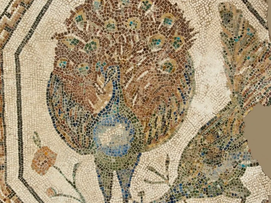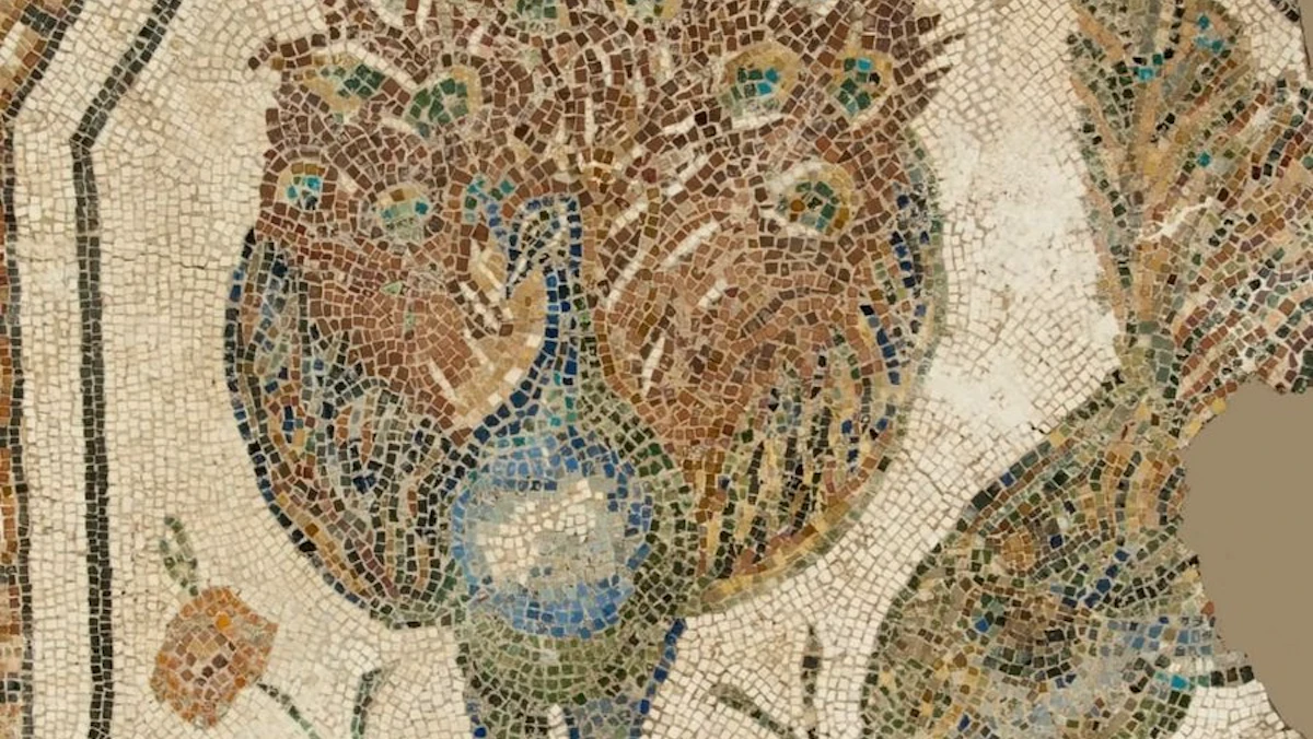 وتصوّر الفسيفساء كرمة تتسلل حباتها من أوان وأنماطاً هندسية بالأبيض والأسود، وببغاء أخضر لامع يقف على فرع شجرة.